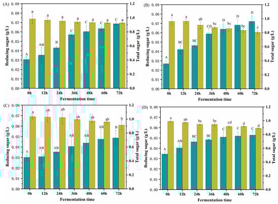 The content reducing sugar (dark cyan, left bar) and total sugar (dark yellow, right bar): (A) carrageenan (C107615), (B) κ-carrageenan, (C), ι-carrageenan (D) λ-carrageenan. Different letters (A, B, C, D) indicated significant differences in reducing sugar at different time points (p < 0.05); Different letters (a, b, c, d) indicated significant differences in total sugar at the different time points.