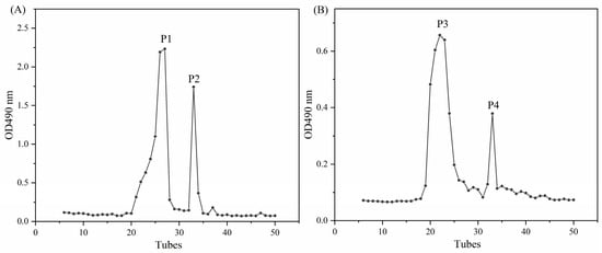 The LH-20 column chromatography elution curves of fermentation products: (A) ι-carrageenan, (B) λ-carrageenan.