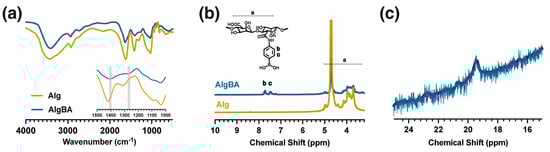 Figure 1 shows the spectroscopic characterization of AlgBA. The FT-IR spectra (Figure 1a) of sodium alginate and AlgBA show the characteristic bands of polysaccharides with carboxyl, carboxylate, and hydroxyl groups: a broad band at 3400 cm−1 (ν, O–H), 2925 cm−1 (ν, C–H), 1638 cm−1 (δas, COO), 1409 cm−1 (δs, COO), 1034 cm−1 (δ, O–C–O), and 1300 cm−1 (δ, C–C–H) The two spectra differ only in the presence of bands at 1450 and 1340 cm−1, associated with C–B and B–O bond stretching, respectively. Additionally, characteristic signals at 3.5 and 4.0 ppm correspond to the basic structure of the polymer in both spectra. At the same time, the peaks at 7.5 and 8.0 ppm are attributed to protons from phenyl groups (Figure 1b; AlgBA), which are absent in the alginate spectrum (Figure 1b; Alg). The 11B NMR spectra (Figure 1c) also displayed a peak at 19.37 ppm, indicating sp3 boron hybridization in AlgBA [38]. Inductively coupled plasma mass spectrometry (ICP-MS) was used to identify and quantify the boron content in AlgBA, which was found to be 0.86%, equal to a degree of substitution of 18%.