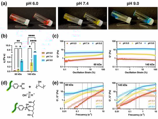 Our data show that the increase in molecular weight of PVA leads to an increase in viscosity and complex modulus (Figure 2c). For example, at pH 9.0, the viscosity increases from 0.45 ± 0.05 Pa s to 3.02 ± 0.29 Pa s for PVA 60 kDa and 145 kDa, respectively. Similarly, the modulus varies by approximately 4.95 ± 3.04 Pa to 11.51 ± 5.20 Pa for PVA 60 kDa and 145 kDa, respectively. The increase in viscosity and the modulus with PVA molecular weight is due to increased crosslinking, which enhances chain interactions as the PVA molecular weight increases [40]. The greater availability of 1,3 cis-diols to form boronate esters and physical crosslinking due to chain entanglements and hydrogen bond formation can be attributed to the increase in network connectivity, considering that the concentration of AlgBA remains constant in both formulations.