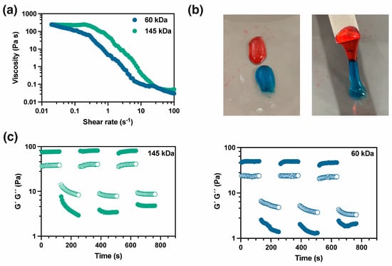 The shear thinning properties of the hydrogel were investigated by flow testing. Figure 3a shows the viscosity profiles as a function of shear rate. Both hydrogels show similar zero shear viscosity (ca. 230 Pa·s); however, the hydrogel formulated with PVA 145 required a higher shear rate to reduce the viscosity, which is attributed to interactions between polymer chains due to the molar mass. To demonstrate the self-healing behavior of these hydrogels, Figure 3b qualitatively shows the self-repair properties of the hydrogel when two samples are put in contact. Additionally, time sweep tests were carried out to assess the recovery of the to the hydrogels. For this purpose, the hydrogels were subjected to three deformation cycles, applying 0.1% and 100% deformation. The results show that hydrogels possess a superior recovery capability, with both G′ and G″ remaining nearly constant across all cycles and demonstrating microstructure recovery.