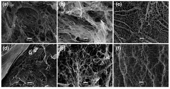 SEM images (scale 10 μm) of lyophilized hydrogels (a) AlgBA/PVA60 pH 6.0; (b) AlgBA/PVA145 pH 6.0; (c) AlgBA/PVA60 pH 7.4; (d) AlgBA/PVA145 pH 7.4; (e) AlgBA/PVA60 pH 9.0; (f) AlgBA/PVA145 pH 9.0.