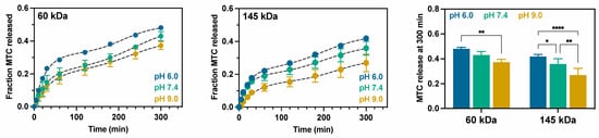 Release experiments were performed for AlgBA/PVA60 and AlgBA/PVA145 hydrogels at pH 6.0, 7.4, and 9.0. The selection of specific pH values for this study is intricately linked to the physiological interactions and stability of the complex in various media. A pH of 6.0 is chosen to simulate acidic environments commonly found in certain pathological conditions, such as inflamed or tumor tissues. The pH of 7.4 represents the typical physiological pH of blood and extracellular fluids under normal body conditions. Finally, the choice of pH 9.0 is related to the stability of the complex, as this pH is greater than the pKa of the boronic acid complex, ensuring the deprotonation of boronic acid and enhancing its binding affinity and stability in basic conditions. The results are presented in Figure 5, which shows that drug release occurred through diffusion within the hydrogel network, driven by a concentration gradient. The curves reveal changes in release behavior are observed with increasing pH. Alkaline pH decreases both the release rate and the amount of MTC released, while acidic pH favors the release of MTC. This behavior was observed for PVA with 60 and 145 kDa molecular weights.