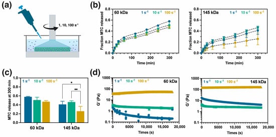 Release profile of MTC through shear forces. (a) Scheme of the system used to assess the MTC release in a rheometer, (b) cumulative MTC release from AlgBA/PVA60 and AlgBA/PVA145 hydrogels at pH 7.4, (c) MTC release at 300 min (statistical analysis: two−way ANOVA, Sidak test 95% confidence interval; * p < 0.0332; ** p < 0.0021), (d) change in storage modulus (G′) of hydrogels during the release studies.