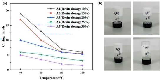 Urea formaldehyde resin concentration optimization results: (a) variation in curing time with temperature for different urea formaldehyde resin dosages; (b) curing effect of urea formaldehyde resin at 25% addition rate.