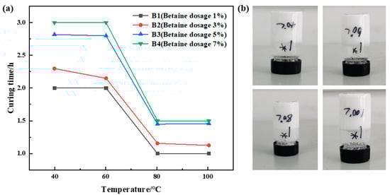 Optimization results of betaine concentration: (a) variation in curing time with temperature at different betaine dosages; (b) curing effect of betaine dosage of 1%.