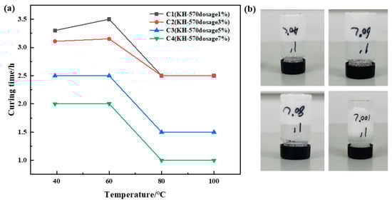 Optimization results of coupling agent concentration: (a) variation in curing time with temperature for different coupling agent dosages; (b) curing effect of 1% dosage of coupling agent KH-570.