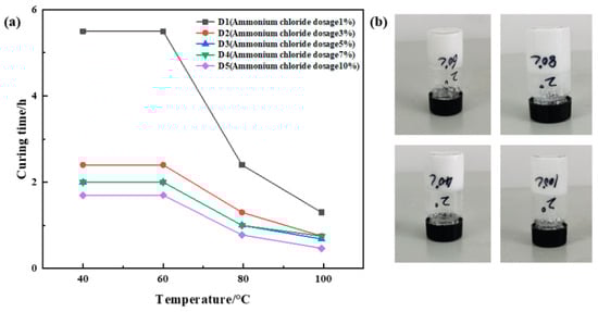 Optimization results of ammonium chloride concentration: (a) variation in curing time with temperature at different ammonium chloride dosages; (b) curing effect of ammonium chloride addition of 3%.