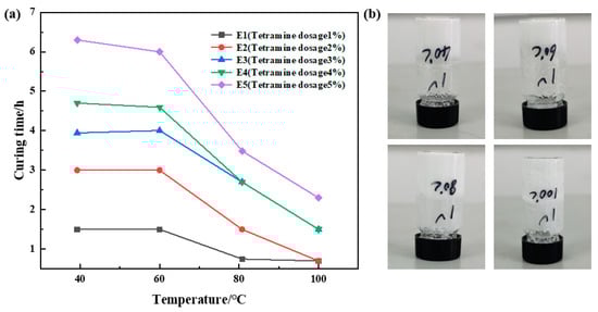 Optimization results of hexamethylenetetramine concentration: (a) variation in curing time with temperature at different hexamethylenetetramine dosages; (b) curing effect of hexamethylene tetramine at 1% dosage.