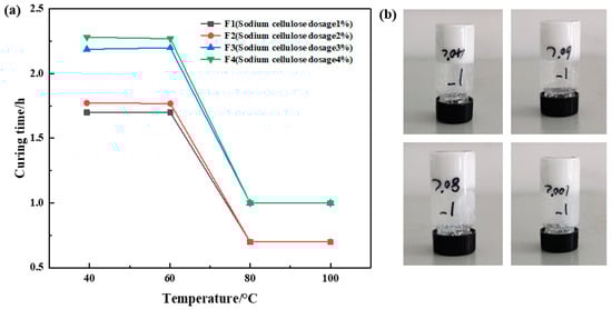 Optimization results of sodium carboxymethyl cellulose concentration: (a) variation in curing time with temperature at constant sodium carboxymethylcellulose addition rate; (b) curing effect of sodium carboxymethyl cellulose addition at 1%.