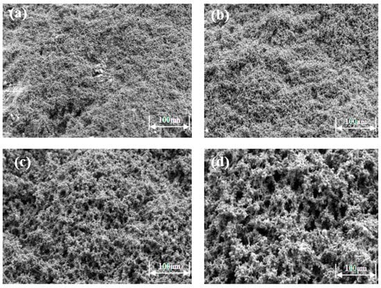 The experimental results showed that the curing time of the resin plugging system was increased, and the curing strength of the resin was greatly affected by the preparation of a resin plugging slurry with salt water containing different concentrations of Ca2+. The higher the temperature, the shorter the curing time of the resin plugging system. At the same time, different concentrations of Ca2+ brine have a great influence on the curing strength of resin, and the curing strength of the resin plugging system prepared with 5000 mg/L~100,000 mg/LCa2+ brine is the best. The resin samples prepared with Ca2+ brine of different concentrations were tested through scanning electron microscopy to observe their microstructure, and the results are shown in Figure 16. Through observation, it can be seen that when the concentration of Ca2+ is between 50,000 mg/L and 100,000 mg/L, the three-dimensional network structure formed is dense and uniform. When the concentration decreases and the temperature is high, the curing strength is weak, and the curing time is generally slightly longer than that of the resin mortar prepared with Na+ brine, which has a greater impact on the curing strength of the resin and reduces the curing strength of the resin plugging system to a certain extent.