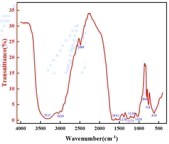 The chemical structure of the high-strength curable resin was analyzed using a Fourier transform infrared spectrometer (Nicolet iS50 FT-IR, Thermo Fisher Technologies, Shanghai, China). Prior to analysis, the high-strength curable resin was washed with deionized water to remove unreacted components, dried in a vacuum oven, and ground into powder. The samples were prepared using the potassium bromide pressing method, with an infrared spectral scanning range of 4000–400 cm−1, at a scanning temperature of 25 °C, a resolution of 1 cm−1, and over eight scans. The experimental results are illustrated in Figure 8. The infrared spectroscopic analysis results indicated that the characteristic peaks of the high-strength curable resin changed consistently. The wave number of the amide group peaks gradually shifted to a lower wave number, indicating the formation of more hydroxymethyl and ether bonds. The curing reaction subsequently reduced these structural elements, confirming the successful preparation of the high-strength curable resin.