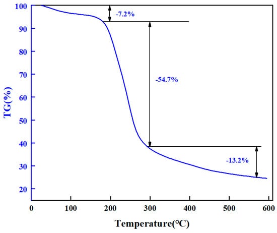 The thermogravimetric analyzer (TGA550, Chicago, IL, USA) was used to detect the thermal stability of chemical bonds in high-strength curable resin powders. First, the high-strength curable resin was placed in the oven at 105 °C to remove the water. During each measurement, a sample of 10 to 15 mg of high-strength curable resin was placed in a sealed pan, and the sample was heated from 25 °C to 600 °C at a rate of 20 °C/min. The experiment was carried out in a nitrogen atmosphere of 50 mL/min. The experimental results are shown in Figure 9. Under high-temperature conditions, the curable resin will undergo thermal degradation, causing the molecular chain to break, resulting in the loss of the original properties of the polymer. The thermogravimetric curve of the plugging resin was analyzed to understand its thermal stability. It can be seen from the thermogravimetric curve in Figure 9 that the initial decomposition temperature of the resin system is about 181 °C, and the thermogravimetric weight is divided into three stages. The thermal decomposition of the first stage of the resin begins to occur at about 50 °C, and the weight loss from 50 °C to 181 °C is 7.2%, which is mainly free water and bound water. The weight loss at 295.0 °C is about 54.7%, mainly due to the decomposition of amide groups. At 295.0 °C to 571.0 °C, the thermogravimetric loss reached 13.2%, more hydroxymethyl and ether bonds were formed, and the structural elements were reduced after curing. The results show that the thermal decomposition of the resin plugging agent is stable at about 180 °C, and the thermal stability is good.