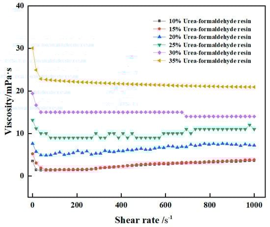 Viscosity is an important parameter to characterize rheological properties. The rheological properties of the high-strength curable resin before curing were tested using the HAAKE MARS 60 high-temperature and high-pressure rotary rheometer. The viscosity of the high-strength curable resin solution before curing changed with the shear rate measured by the Harker rheometer, and the results are shown in Figure 10. The experimental results show that the viscosity of the high-strength curable resin system can stay stable with the increase in shear rate. The viscosity of the curable resin system with the addition of 10–15% resin matrix is about 2–3 mPa·s, and the viscosity is low. The viscosity of the curable resin system with the addition of 20–30% resin matrix is about 5–15 mPa·s, and the viscosity is moderate. The viscosity of the curable resin system with the addition of 35% resin matrix is about 22 mPa·s. When the shear rate is less than 100 s−1, the viscosity gradually decreases and becomes stable. When the shear rate is greater than 100 s−1, the viscosity remains basically unchanged. When 10% resin was added, the viscosity was stable at 2 mPa·s. The viscosity is stable at 7 mPa·s when 20% resin is added. When 30% resin is added, the viscosity is stable at 15 mPa·s. The viscosity is stable at 22 mPa·s when 35% resin is added. Overall, in order to facilitate the injection of a high-strength curable resin system and its mixing with suspension materials, the resin system should have a certain viscosity to facilitate the suspension of other additive materials.