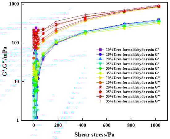 The energy storage modulus (G′) and the loss modulus (G″) are important parameters for characterizing rheological properties. The changes of the energy storage modulus and loss modulus with shear stress before curing of high-strength curable resin solution with different concentrations were tested by the HAAKE MARS 60 high temperature and high pressure rotational rheometer. The experimental results are shown in Figure 11. The experimental results show that the energy storage modulus and loss modulus of the cured resin solution with different concentration and high strength increase with the increase of shear stress, and the loss modulus is greater than the energy storage modulus, which is a viscous fluid. At the same time, it is found that the increase of urea-formaldehyde resin content has little effect on the energy storage modulus and loss modulus of the curable resin, and the change law is basically consistent with the increase of shear stress.