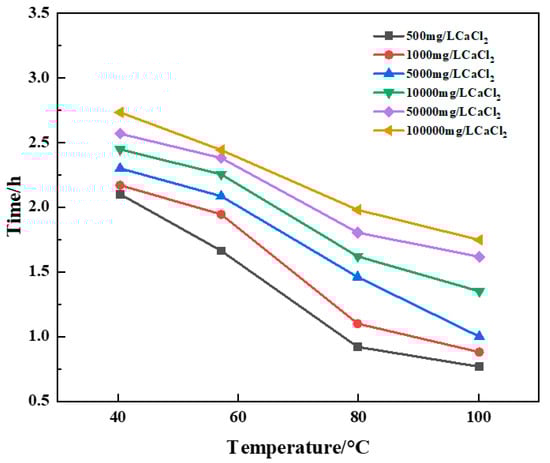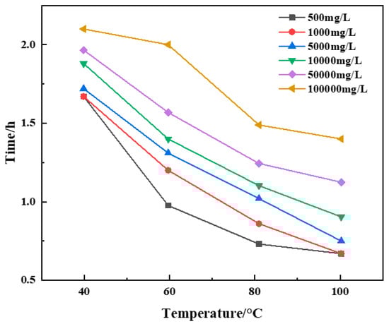 Aqueous solutions containing Ca2+ were prepared with concentrations of 500 mg/L, 1000 mg/L, 5000 mg/L, 10,000 mg/L, 50,000 mg/L, and 100,000 mg/L, respectively, and resin plugging systems were prepared with different concentrations of saline. The effects of saline concentrations on curing time at different temperatures were studied. The experimental results are shown in Figure 15 and Table 3.