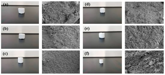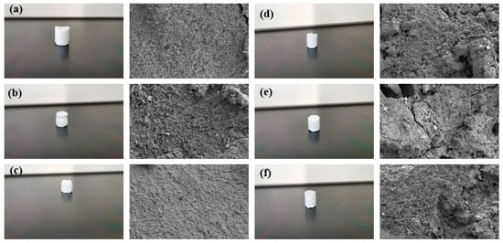 The sample and its microstructure were cured using a resin plugging system with different Ca2+ concentrations: (a) 500 mg/L; (b) 1000 mg/L; (c) 5000 mg/L; (d) 10,000 mg/L; (e) 50,000 mg/L; (f) 100,000 mg/L.