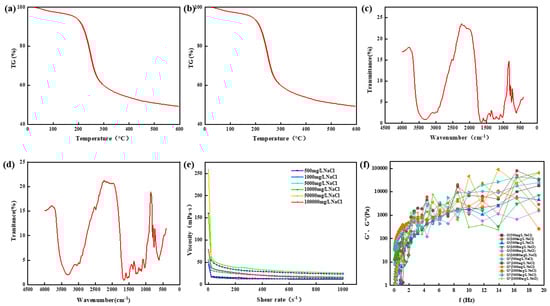 Physicochemical properties of thermosetting resin sealers. (a) Thermogravimetric analysis of samples with Na+ concentration of 5000 mg/L. (b) Thermogravimetric analysis of samples with Na+ concentration of 10,000 mg/L. (c) Infrared spectrum analysis of samples with Na+ concentration of 5000 mg/L. (d) Infrared spectrum analysis of samples with Na+ concentration of 5000 mg/L. (e) Viscosity change of resin system under different Na+ concentrations. (f) The change in the energy storage modulus and the loss modulus of the resin system with frequency.