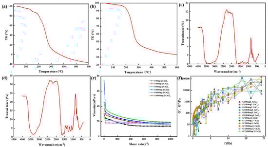 Physicochemical properties of thermosetting resin sealers. (a) Thermogravimetric analysis of samples with Ca2+ concentration of 5000 mg/L. (b) Thermogravimetric analysis of samples with Ca2+ concentration of 10,000 mg/L. (c) Infrared spectrum analysis of samples with Ca2+ concentration of 5000 mg/L. (d) Infrared spectrum analysis of samples with Ca2+ concentration of 5000 mg/L. (e) Viscosity change of resin system under different Ca2+concentrations. (f) The change in the energy storage modulus and the loss modulus of the resin system with frequency.