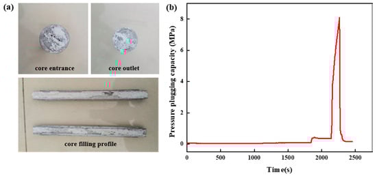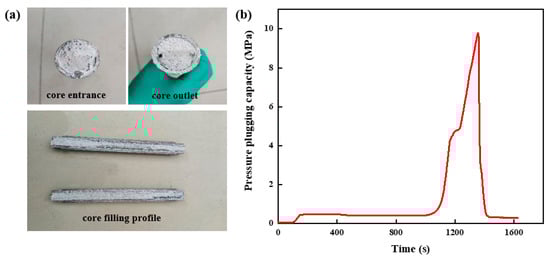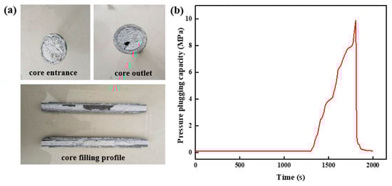 The shape of the high-strength curable resin plugging system solution after curing in the wedge fracture with an inlet end of 5 mm and an outlet end of 3 mm to form a slug is shown in Figure 19a. The high-strength curable resin solidifies after polymerization reaction and has a weak gravitational settling effect. It can fill wedge fractures evenly and effectively plug fractures. This is mainly due to the high-strength curable resin solution’s viscosity; the gravity settlement effect is small, and it easily stays in the fractured formation to form a uniform and effective filling. The high-strength curable resin system was injected into the plugging test device according to the plugging test steps, and the whole plugging layer was formed after solidification and then displaced. The pressure change curve inside of the core was obtained, as shown in Figure 19b. When the pressure reaches 9.98 MPa, the pressure drops instantaneously, indicating that the integrity of the resin plugging layer has been destroyed under the action of fluid pressure. After breaking through the resin barrier, the pressure drops rapidly and becomes stable.