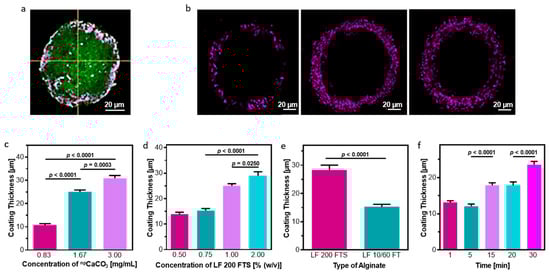 Alongside the dependence on the concentration of npCaCO3, the coating thickness was investigated as a function of the concentration of alginate (Figure 2e). While varying the concentration of alginate below 0.75% did not affect the coating, using concentrations of 1% or 2% led to the creation of a significantly thicker shell around the microgel.
