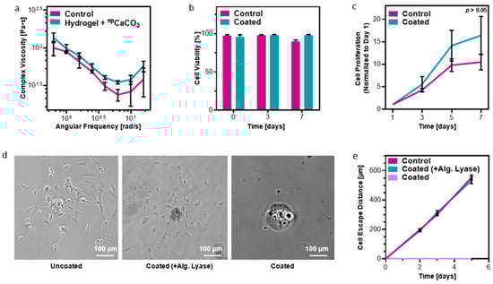Functionality and biocompatibility of the alginate coating. (a) The addition of npCaCO3 caused no significant changes in the rheological properties of the ECM-based hydrogel. (b) The cell-coating protocol had no negative impact on cell viability, and, indeed, showed a positive increase in cell viability after a week of cultivation. (c) The presence of the alginate coating did not impair cell viability. In fact, because the coating acted to protect the microtissue, coated microtissues remained larger and thus were able to accommodate larger and more active cell populations. (d) Representative images showing cells that had escaped from the droplet and adhered to the well plate on Day 3 in both uncoated (left) and coated-then-enzymatically-degraded (center) droplets. Droplets with an intact alginate barrier showed negligible cell escape (right). Scale bars = 100 µm. (e) The presence of the coating almost entirely halted the ability of the cells to migrate out of and away from the microtissue. The impact of the alginate was further verified by enzymatically degrading the alginate, which led to unimpaired “cell escape”.