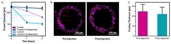 Having ascertained that the presence of an alginate coating not only did not harm cells, but in fact led to greater retention and viability, the behavior of the coating itself was investigated. First, microdroplets were exposed to collagenase to mimic the degradation processes that would occur in vivo, and the degradation kinetics of the ECM-based hydrogel was measured (Figure 4a). Droplets without a protective alginate layer rapidly decreased in size, with a reduction in the average droplet diameter to only 45.9 ± 1.06% of its original diameter over the course of 24 h. Interestingly, even without collagenase, unprotected droplets gradually decreased in size over the course of 48 h. This suggests that water molecules gradually pry apart the biopolymers that compose the ECM-based hydrogel even in the absence of relevant degradation enzymes. On the other hand, droplets protected by a layer of alginate showed no decrease in diameter over the course of the experiment. This demonstrates that the alginate shell acted as an effective two-way barrier, both preventing the ECM-based hydrogel’s biopolymers from washing away, even if they became dislodged from the bulk, and preventing the collagenase enzymes from entering the droplet and cleaving the biopolymers, which would have resulted in smaller fragments of polymer that may be able to diffuse across the alginate barrier.
