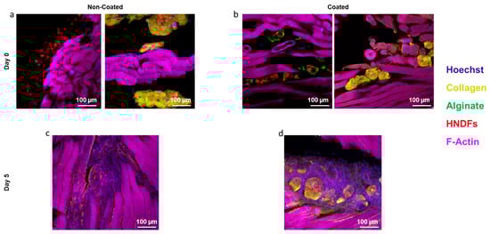 Finally, as the motivation for this research was the formulation of protected microtissues to be used for regenerative medicine, microtissues were injected into the gastrocnemius of six-week-old, female C57/BL mice. The mice were sacrificed either immediately or five days post-injection, and the injection site was analyzed post mortem. In particular, immunofluorescent staining was performed to detect the presence of cell nuclei, F-actin (to stain native mouse tissue), collagen type I (the main component of the ECM hydrogel), and alginate. Additionally, the cells used in generating the microtissues were genetically modified to express red fluorescent protein (RFP) so that they could be readily viewed and distinguished from the native mouse cells. The success of the injection can be easily ascertained from the presence of cells and collagen on Day 0 (Figure 5a,b).