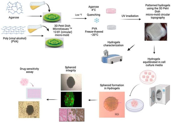 In this study, we aimed to fabricate patterned agarose and PVA hydrogels using 3D Petri Dish® micro-molds with a circular topography (12–81) to act as a platform for HeLa spheroid formation. The protocol followed for preparing the hydrogels and their biological evaluation is outlined in Figure 1.