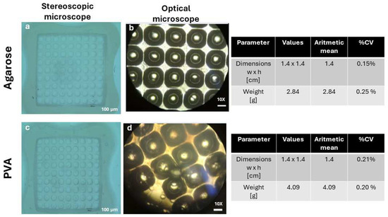 Agarose and PVA were used due to their biocompatibility, softness, and non-adherence properties. Cell-cell interactions are favored by inducing the formation of cell aggregates that will give rise to spheroids [7,12]. Figure 2a–c shows the morphology of agarose and PVA wet hydrogels and their dimensions and weights. The 3D Petri Dish Microtissues® were used with a circular topography for 9 × 9 wells, identified as 12–81 micro-molds. Each of their wells has a concave bottom 800 μm long. The morphology of the obtained micro-molds was analyzed using a microscope, and the internal morphology (pits) was analyzed in an inverted microscope.