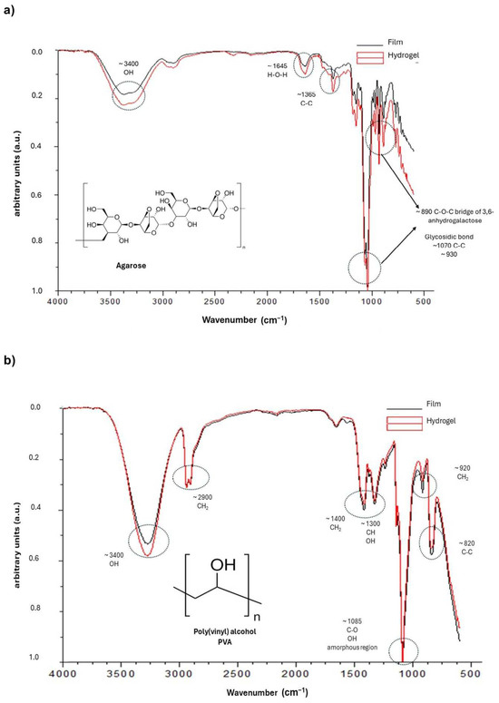 The ATR FT-IR spectra of the agarose and PVA hydrogels were recorded and depicted in Figure 4. Films were prepared, analyzed, and compared to the hydrogel spectra to better understand the chemical interactions. The IR spectra of agarose films and hydrogels are shown in Figure 4a. The main characteristic absorption bands of agarose were detected at 3430 cm−1 (stretching band of hydroxyl group), 1365 cm−1 (C-C), 1070 and 930 cm−1 (glycosidic bond), and 890 cm−1 (vibration of C-O-C bridge of 3,6-anhydrogalactose unit) [21,22,23,24]. The gelation of agarose is due to the aggregation of polymer chains, promoting the formation of hydrogels [29]. The FTIR peaks of the agarose hydrogels were similar to those of the films, which suggests that no covalent interactions occurred during the preparation process of the agarose hydrogels, probably due to the formation of van der Waals and/or hydrogen bonds which form a hydrogel network after physical gelation induced by a thermal process such as solvent evaporation (film) and quenching (hydrogel) [21,22,23,30,31,32].