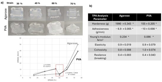 Texture profile analyses (TPAs) of the agarose and PVA hydrogels. (a) Detailed stages of the cyclic compression experiment and the stress vs. strain graph of the cyclic compression of the samples (b). The hardness, adhesiveness, and young modulus values of the agarose and PVA hydrogels presented statistical differences, The values are expressed as the mean ± standard deviation (SD) of three independent experiments. The data were analyzed with a two-way ANOVA followed by Tukey’s multiple comparison test. * p ≤ 0.05 comparing agarose and PVA hydrogels.