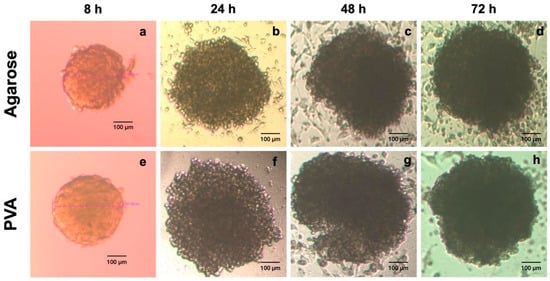 Our findings are according to the Petri Dish protocol at the initial times. However, after 24 h, the spheroids increased in size. In the agarose and PVA hydrogels, the cells formed cell clusters within 8 h after cell culturing on the hydrogels, with an average size of ~ 300–400 μm (Figure 6a–e). A continuous increase in spheroid diameter was observed with time (Figure 6a–h). Most cells were arranged in cell islands or loose cell aggregates. HeLa spheroids with a mean size of ~700–800 μm were observed, and only low numbers of non-adherent cells were observed in the growth medium. The 3D structure shown by the spheroids was characterized by being compact and having a round shape at all times (Figure 6a–h). In general, a homogeneous pattern of spheroid size developed. The characteristic 3D structure was established after 72 h in culture for subsequent analyses.