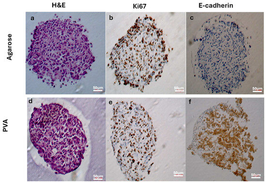 Histological and immunohistochemical analysis. HeLa cell spheroids after 72 h of culture in a standard medium in hydrogels. Histological images of H&E-stained HeLa spheroids after 72 h of culture (scale bar, 50 μm) in agarose (a) and PVA (d) hydrogels. Immunohistochemistry of HeLa spheroids in hydrogels after 72 h of culture (scale bar, 50 μm). Positive staining reactions for Ki67 are observed in HeLa spheroids cultured from agarose (b) and PVA (e) hydrogels with no difference in the staining pattern. No E-cadherin expression was observed in HeLa spheroids from agarose hydrogels (c), but a positive staining reaction was observed in HeLa spheroids from PVA hydrogels (f).