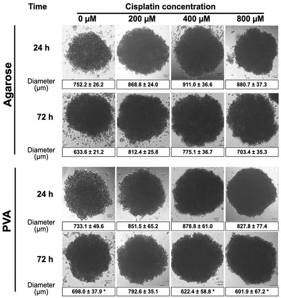 The drug was administered in different concentrations (200, 400, and 800 µM) to spheroids from both hydrogels. Figure 8 shows the results of the size and morphology of spheroids after Cis exposure using an inverted microscope. The size of the spheroids from the agarose hydrogels increased when the Cis concentration increased regardless of exposure time. The size of the spheroids increased from ~725 μm to ~911 μm at 24 h. Meanwhile, a size increase was observed from ~633.31 μm to ~775.12 μm at 72 h.