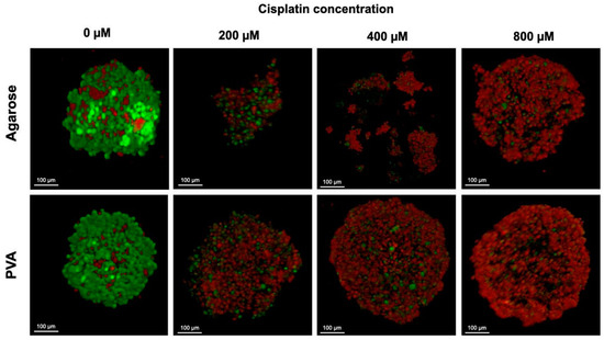 Figure 9 shows the images of the live/dead stained spheroids from the agarose and PVA hydrogels. Furthermore, the spheroids formed in the PVA hydrogels were more compact than those from the agarose hydrogels. The macroscopic appearance of spheroids without Cis exposure showed a spherical structure. Most cells were alive (green signal), and some dead cells were observed (red signal) inside the spheroid. The results indicate high cell viability, suggesting an adequate exchange of nutrients and gases, and therefore, the growth and functionality of HeLa cells. Treated spheroids from the agarose hydrogels lost their spherical shape and appeared disintegrated. Some cells were separated from the main spheroid body or exhibited condensed nuclei due to cell death. Treated spheroids from the PVA hydrogels were spherical and looked more compact than those from the agarose hydrogels. No spheroid disintegration was observed regardless of the concentration of Cis to which they were exposed. The exchange of nutrients and gases and the growth and functionalities are also meaningful [14]. Three-dimensional spheroids have an external proliferating zone and an internal quiescent zone caused by the lack of nutrients and gas exchange (e.g., O2, CO2) [69].