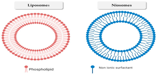 Liposomes and niosomes (Figure 2) are recognized as the first identified vesicles [30]. Liposomes are small spherical vesicles composed of lipid bilayers (phospholipids and cholesterol) with a diameter ranging from 0.05 to 5.0 μm. The term “liposome” is derived from the Greek words “lipos” meaning fat and “soma” meaning body [31]. Due to their hydrophilic and lipophilic characteristics, they are very suitable for drug administration in various structures, making them a very promising option [32,33]. This drug delivery technique aims to precisely target the pharmacologically active compounds to the intended site of action [34]. Liposomes possess a special characteristic that allows them to trap hydrophilic and lipophilic compounds within their compartments and provide a controlled-release effect. They are also biocompatible, biodegradable, and stable [33,35].
