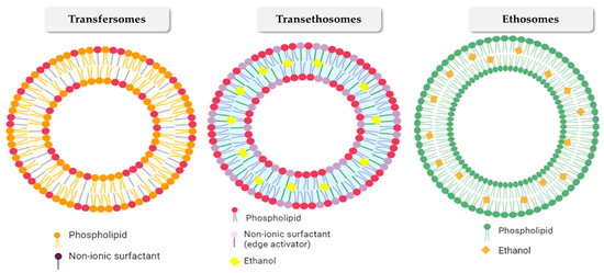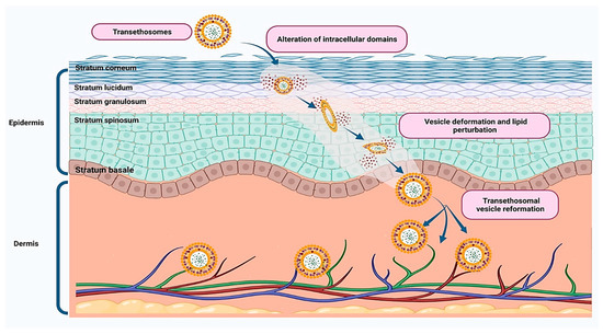 As a consequence of the considerable study that was conducted and published on transfersomes and ethosomes, a new generation of nanovesicular carriers emerged, which includes transethosomes, and glycerosomes. In recent years, these unique ultra-deformable vesicular systems have garnered interest [75,80]. Transethosomes, phospholipid nanovesicular carriers, combine ethosomes and transfersomes characteristics with ≥20% ethanol concentration and edge activators. Transethosomes are novel nanovesicular structures that resemble ethosomes (phospholipids, ethanol, and water) but include an edge activator or surfactant (penetration enhancer). They benefit from transfersomes and ethosomes [81,82]. Transethosomes promote medication penetration and bioavailability across skin barriers, permitting tailored administration to particular skin tissues (Figure 5). During skin permeation, the nanovesicular structure of transethosmes is maintained through deformation and reformation. The deformation of the lipid bilayer caused by an edge activator plays an essential role in the transdermal application of transethosomes [83].