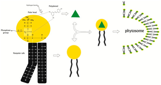 Proposed concept for the production of phytosomes. The creation of hydrogen bonds between phytochemicals and the polar head of phospholipids is illustrated through schematic and structural images. Dashed lines symbolize the hydrogen bonds [105].