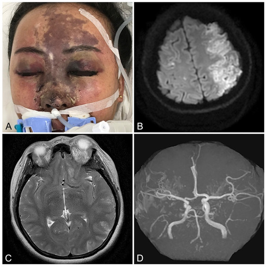 Example of extensive facial soft tissue ischemia with neuro-ophthalmological sequelae resulting from iatrogenic filler embolization: (A) Appearance of 40-year-old female 5 days following arterio-embolic injury resulting from dorsal nasal hyaluronic acid filler augmentation, revealing ischemic changes of the frontonasal skin of the face. (B) Diffusion-weighted axial magnetic resonance imaging (MRI) demonstrating left hemi-frontoparietal cerebral infarction. (C) T2-weighted axial MRI revealing edema and ischemic changes affecting the left optic nerve and orbital soft tissues. (D) Magnetic resonance angiography demonstrating intact proximal cerebral circulation (circle of Willis and anterior, middle, and posterior cerebral arteries), suggesting a distal embolic etiology. Reproduced with permission from Yang et al. [3], 2020, Springer Nature.
