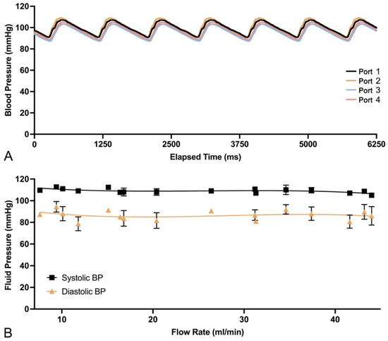 Calibration of the PULSAR unit was performed in triplicates across a physiological range of heart rates (specifically 60, 70, 80, 90, and 100 bpm) and relevant stroke volumes (3, 4, and 4.5 mL/beat), aiming to stay within the physiological blood pressure range (95–165/65–105 mmHg) and common carotid-artery flow rates (140–620 mL/min) for the general population [60,61,62,63,64]. Pressure calibration was achieved by adjusting the outflow regulator clamp controlling the BMF return path toward the fluid housing and by control of an additional regulator (Flow Controller Extension Set, Amsino International, Pomona, CA, USA) at the distal sampling line connected to port 3 (Figure 14A). Flow rates were directly measured from the inoculation access port (port 1) over 10 s, also performed in triplicates. Blood pressure measurements were recorded over 1 min and exported into digital spreadsheets in Microsoft Excel software version 16.83 (Microsoft Corp., Redmond, WA, USA) with calculation of average systolic and diastolic pressures, mean arterial pressure (MAP), and Reynolds number for each setting (fluid density 1120 kg/m3, dynamic viscosity 0.00674 Pa·s, vessel diameter 0.002 m). Additionally, laminar flow was further confirmed via direct visualization through the opened distal outflow from port 1.