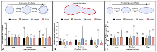 Gel particle morphological analysis: (A–C) Summary plots of average particle circularity, perimeter, and aspect ratio, respectively, at low, medium, and high flow rates for all products.