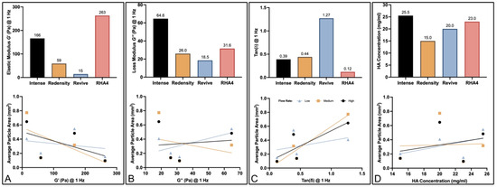 HA gel physical and rheological properties and their correlations with average particle size at low, medium, and high flow rates: (A) Elastic modulus. (B) Loss modulus. (C) Tan(ẟ). (D) HA concentration and their correlation plots.