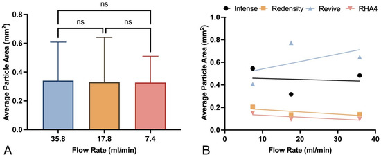 Evaluation of the effect of flow rate on average HA gel particle fragment size: (A) Average particle size for all HA gel products at low, medium, and high flow rates (ns—not statistically significant). (B) Correlation of flow rates and average particle size for individual HA gel products.
