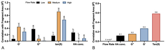 Comparison of correlation coefficients between gel physical properties and flow rates on particle size: (A) Correlation coefficients between G′, G″, tan(ẟ), and HA concentration and average particle size at each flow rate. (B) Overall correlation coefficients with average particle size for all combined rates.