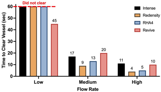 Clearance time of embolic burden for each product at different flow rates.