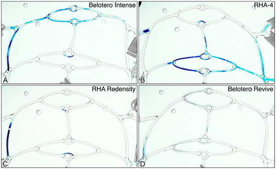 Appearance of obstructive gel plugs and non-obstructive residue following inoculation for all products at low flow rate (7.4 mL/min): (A–D) Obstructive gel plugs for Belotero Intense, RHA4, RHA Redensity, and Belotero Revive, respectively, showing obstructive branch occlusion for Belotero Intense, RHA4, and Redensity and only non-obstructive residue for Belotero Revive.