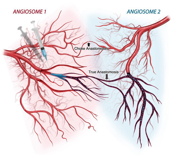 Diagrammatic representation of vascular redundancy in tissues resulting from anastomotic connections between and within angiosomes. In human soft tissues, particularly the skin and skeletal muscle, the presence of anastomoses can provide adequate perfusion pressure to affected regions and offer bypass routes that circumvent embolic restrictions. Generally, redundancy is afforded through the presence of large-caliber true anastomoses (also known as direct anastomoses) and small-caliber, functional choke anastomoses (also known as indirect anastomoses). Direct anastomoses, such as those that exist between the ophthalmic and facial angiosomes, can also provide a direct route for embolic dissemination of gel particles, potentially enabling the occurrence of retinal ischemic injuries arising from injections in the lower face. Reproduced with permission from Soares [1] 2022, MDPI.