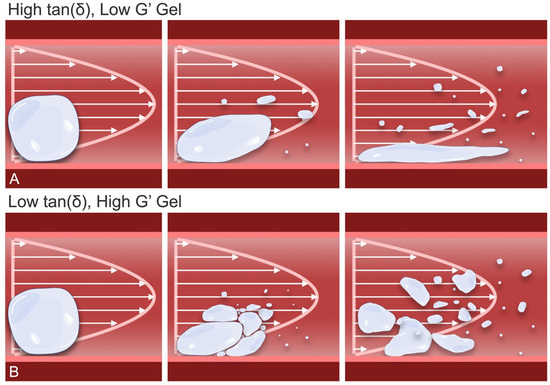 The impact of rheological parameters on the cannulated extrusion and/or intravascular fragmentation of gel particles: (A) High-tan(δ), low-G′ gels, having greater pliability, can deform more easily in response to flow-related shear stresses during extrusion through needles/cannulas or dispersal within arterial conduits. The deformation behavior of these gels allows for streamlining of their shape, reducing exposure to shear stress and resulting in long filamentous fragments that fail/break in a ductile manner. (B) Low-tan(δ), higher-G′ gels, though stronger and better able to resist deformation and shear stresses, upon exposure to the sufficiently high shear stresses of needle extrusion or intra-arterial environments, are unable to deform to the same extent as softer, more pliable gels. As a result, these gels tend to fail in a more brittle manner, progressively fragmenting into smaller, non-filamentous particles.