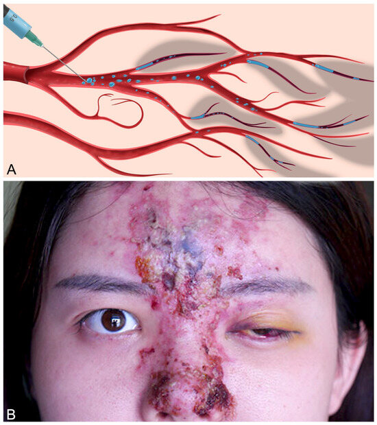 - Zhao, F.; Chen, Y.; He, D.; You, X.; Xu, Y. Disastrous cerebral and ocular vascular complications after cosmetic facial filler injections: A retrospective case series study. Sci. Rep. 2024, 14, 3495. [Google Scholar] [CrossRef]